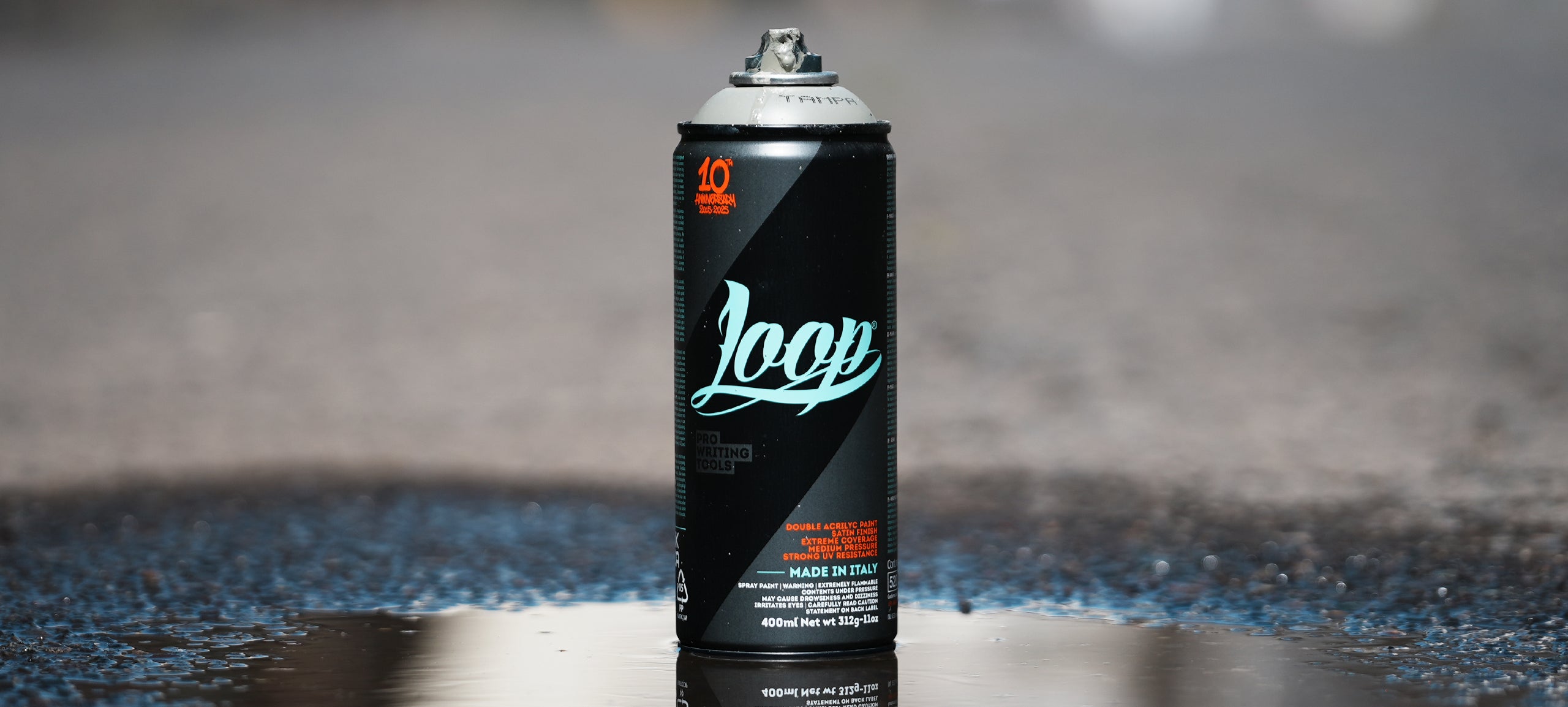 LOOPXDAKING está disponible en una lata de aerosol de 400ml, Se trata de una lata de pintura en aerosol negra de alta cobertura con un acabado satinado.